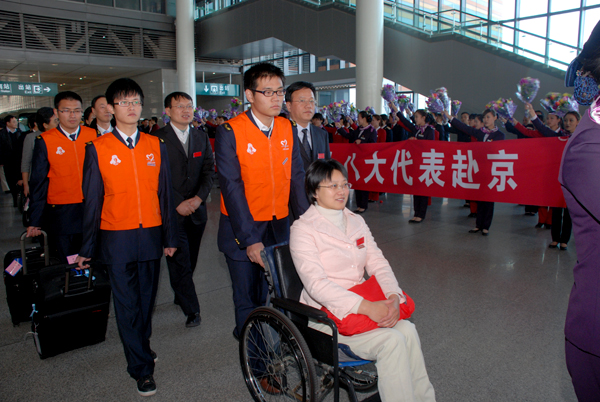 学院志愿者为全国自强模范侯晶晶、全国科技创新典型邓建军等十八大代表提供登车服务