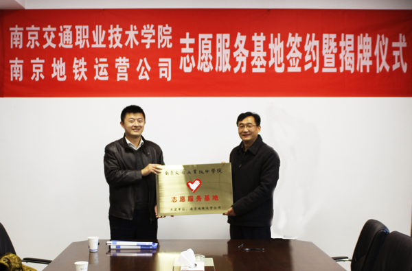 11月20日上午,学院与南京地铁运营公司签订志愿服务协议。院党委副书记许正林和南京地铁运营公司团委书记胡耀华代表双方签约并为服务基地揭牌。