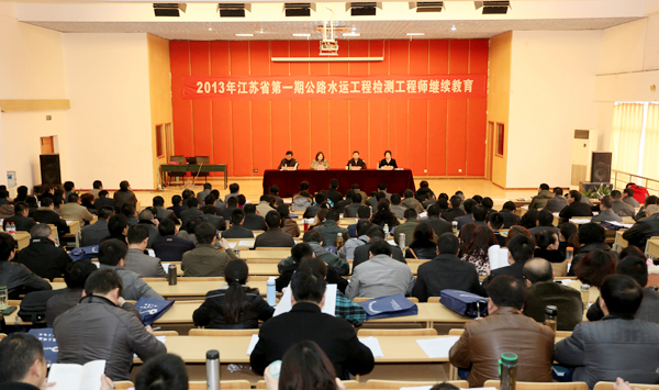 3月27日上午,2013年度江苏省第一期公路水运工程试验检测工程师继续教育培训班在我校顺利开班。参加本次培训的近300学员均为来自省公路水运工程建设一线的检测工程师,培训为期3天,内容为:职业道德;检测数据报告导则;水泥、混凝土配合比设计等新规范宣贯;仪器检定和校准等。