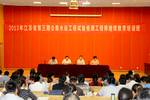 5月28日上午,2013年度江苏省第三期公路水运工程试验检测工程师继续教育培训班在我校顺利开班。参加本次培训的约180学员均为来自省公路水运工程建设一线的检测工程师。本次培训为期3天,内容为:职业道德;检测数据报告导则;水泥、混凝土配合比设计等新规范宣贯;仪器检定和校准等。