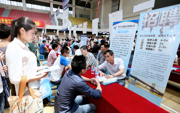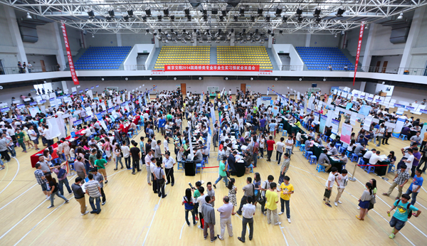 6月5日上午,我校2014届路桥类专业实习预就业双选会在行健馆举行。本次招聘会共吸引了江苏省交通规划设计院、江苏省交通科学研究院、南京路桥工程总公司、南京交通工程有限公司等148家路桥类知名企业前来招聘人才,其中省内企业141家,省外企业7家,共为2014届664名路桥类毕业生提供了1535个岗位,供需比达到2.3:1。与现场“一贤难求”的招聘单位形成鲜明对比的是,多数学生并不急于签约,而是在反复观望和比较中“择优而从”。 即便2013届预就业双选会早在去年已经举行,但现场仍然有优秀的应届毕业生在众多职位中“慧眼淘金”。