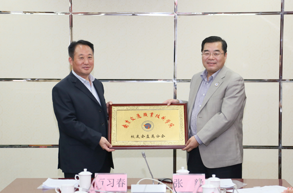 张毅校长向直属分会会长万习春授分会会牌,并代表全校师生员工向直属分会的成立表示祝贺。他简要通报了学校近年来建设发展取得的成绩和60周年校庆筹备情况,希望南京交院校友会直属分会依照章程积极开展工作,发挥校友之间的联络纽带作用,为校友之间相互学习、相互帮助、相互提高提供途径和条件,广大校友要多多关心母校发展,为母校发展献计献策。