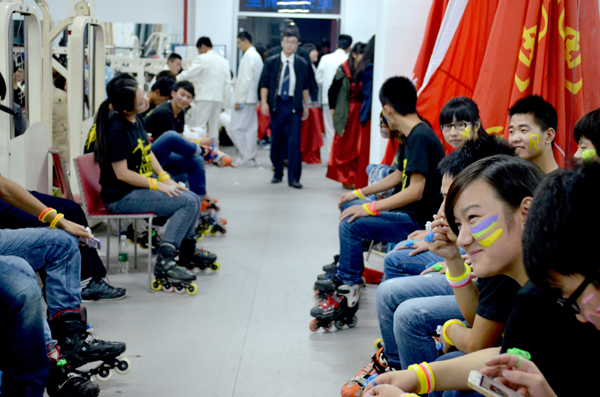 11月7日校庆晚会现场,在后台等待登台演出的校轮滑社队员