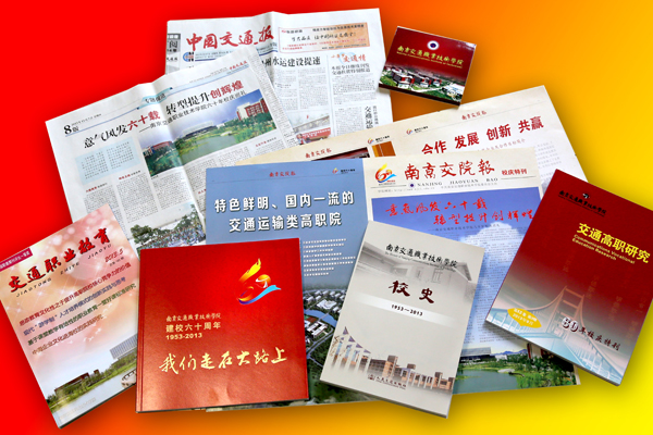 校庆旨在总结办学经验、展示办学成果,凝聚力量,激励前行。图为《中国交通报》南京交院专版、《交通职业教育》南京交院专刊,《校史》、校庆画册、光盘、《南京交院报》专刊、校《高职研究》专刊等一系列展示交院风采的主题图文及影像资料。