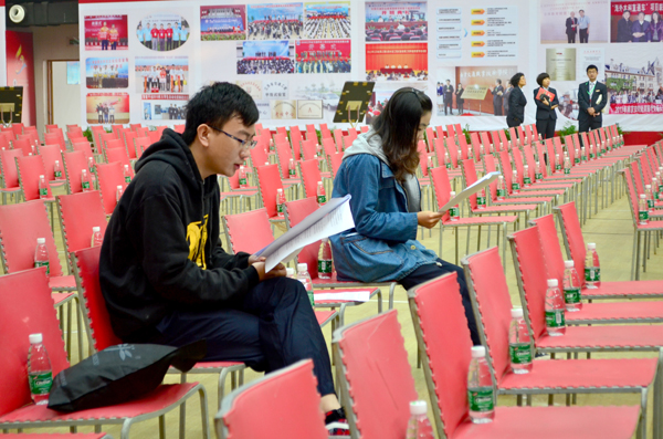 庆祝大会彩排现场,担任主持的同学在熟悉讲稿