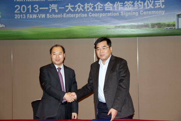 12月11日,一汽-大众在广州举行“伙伴让我飞翔”2013全国职业院校校企合作签约仪式,校长张毅与一汽-大众有限责任公司商务副总经理兼销售有限公司总经理胡咏签订了校企合作协议。