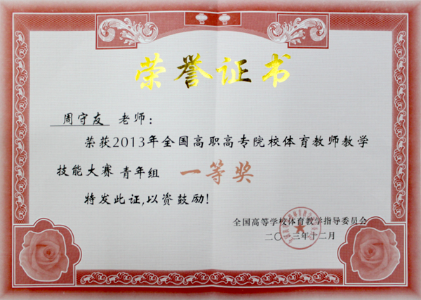 12月18—21日,2013年全国高职高专院校体育教师教学技能大赛在杭州举行。来自全国28个省(自治区、直辖市)的280名高职高专院校体育教师参加了竞赛。江苏省代表队13人参加了本次比赛。我校体育部周守友老师获得“青年男子组一等奖”。