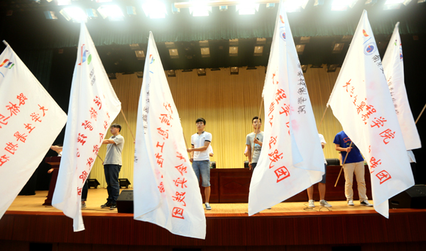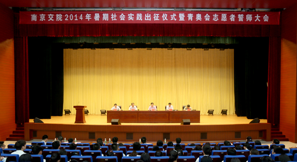 6月19日,来自全院16支实践团队和青奥会志愿者共400余名师生齐聚图文信息楼报告厅,隆重举行2014年暑期社会实践活动出征仪式暨青奥会志愿者誓师大会。院长张毅、院党委副书记许正林等院领导为实践团队颁发立项证书并授旗。