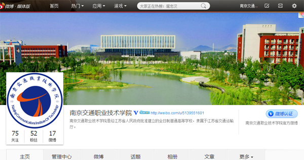 我院在新浪网注册、认证了官方微博并于6月2日上线试运行,设置了“交院动态”、“人才队伍”、“交院学子”、“校企合作”、“招生资讯”、“教育访谈”、“教育观点”、“教育贴士”等栏目。
