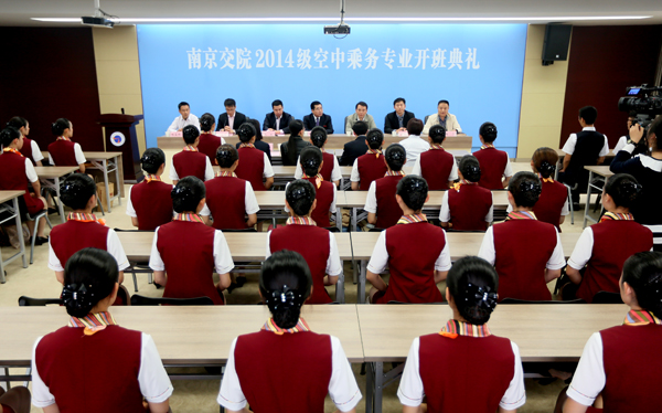 10月16日下午,南京交院2014级空中乘务专业开班典礼在我院弘毅楼223会议室举行。江苏省交通运输厅航空处陆元良处长、中国东方航空江苏有限公司郝铁程主任,北京通航冯刚总监等领导出席开班典礼。我院院长张毅、副院长杨宁、杨益明,教务处、学工处、招就处、校企合作办公室、运输管理学院等部门负责同志,运输管理学院教师代表以及2014级空中乘务专业73名同学参加此次开班典礼。典礼由杨宁副院长主持。