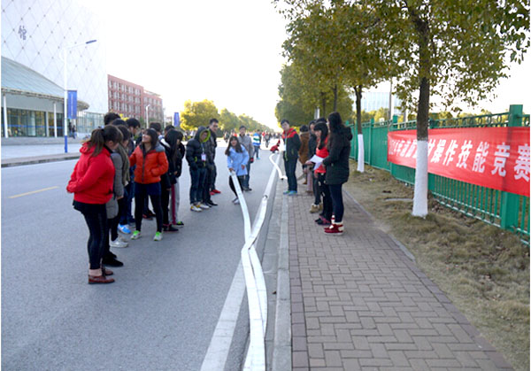 竞赛由快速连接消防水带与枪栓、双人提灭火器灭火两个项目组成。比赛中,面对熊熊燃烧的火焰,选手们毫不惧怕,以熟练的动作和最快的速度把火扑灭,赢得在场师生的热烈掌声。赛前,学院保卫处还组织了20余名学生宿舍管理人员进行了灭火演练。