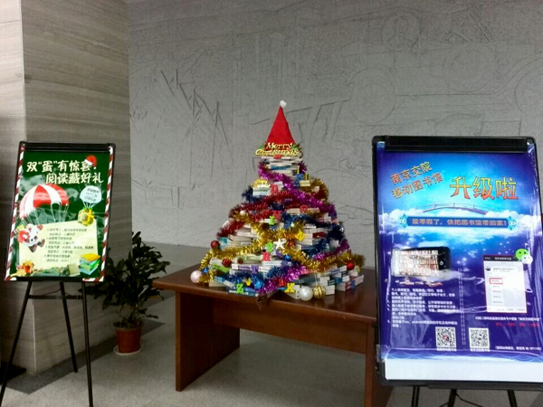 【圣诞三大书愿 寄情寄语随你意】从12月24日开始,图书馆在三楼休闲阅览区放置了三棵2米高的圣诞树,分别是寄语树、许愿树与悦读树。读者选择性填写“你对图书馆想说的话”、“新的一年你的心愿”、“好书读后感言”等卡片内容分别悬挂至相应圣诞树上,通过圣诞树“书”出每个人对图书馆、对家人、对自己、对好书的感受。仅一天时间,圣诞树上就缀满了160多张好书推荐和心愿祝福的圣诞卡片。2015年元旦后,图书馆将从中评选出好书评、好建议。
