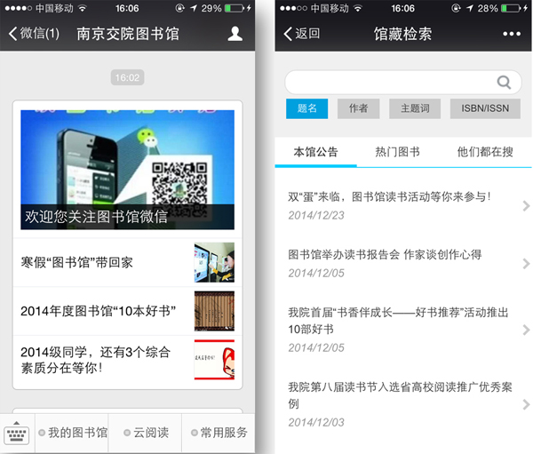 凡我院图书馆读者微信关注“南京交院图书馆”,再绑定读者借阅号后,不需要走进图书馆即通过手机搜寻图书、查询图书借阅信息、浏览图书馆资讯信息,获取好书推荐信息,并享有3万多种资源的在线阅读,如图书、期刊、报纸、视频等。