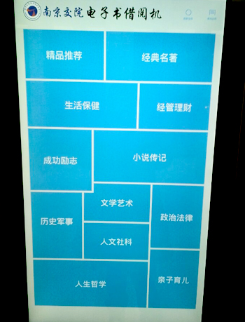 【电子图书借阅 丰富寒假悦读生活】对于大学生来说,假期的充实在于悦读。近日,图书馆二楼大厅特设了一台电子图书借阅机。我院读者使用移动图书馆APP客户端,选中一本书,只需轻松扫码,即可在30秒时间内获取该书的电子版,随时随地享受阅读。该机每月更新图书2000册,多为最新出版的图书,内容板块细分分为精品推荐、经典名著、生活保健、经管理财、成功励志、小说传记、文学艺术、历史军事、人文社科、政治法律、人生哲学、亲子育儿等,读者在寒假前夕均可按需扫描借阅。