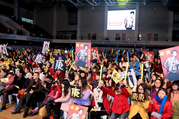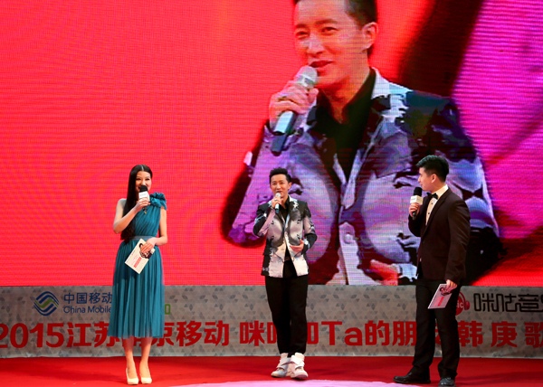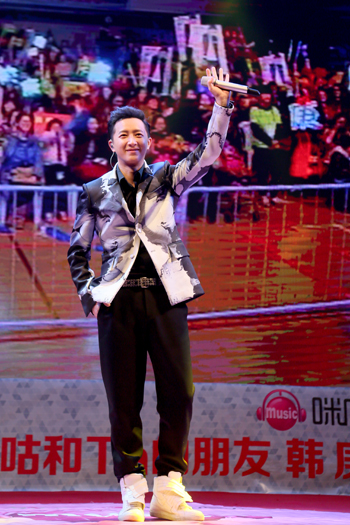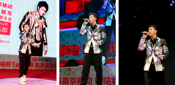 元月4日晚,2015江苏南京移动咪咕和Ta的朋友韩庚歌友会唱响交院。作为韩庚的新年首场歌友会,众多粉丝、歌迷从各地赶来捧场,用歌声、欢呼、尖叫,迎接这场盛大的视听盛宴。当晚,韩庚伴着全场的欢呼声劲爆登场,先后献上《狂草》、《心疼笔记本》、《背叛灵魂》、《小丑面具》等歌曲。全场观众在歌声中与偶像热情互动,尽显音乐魅力。