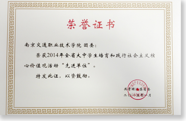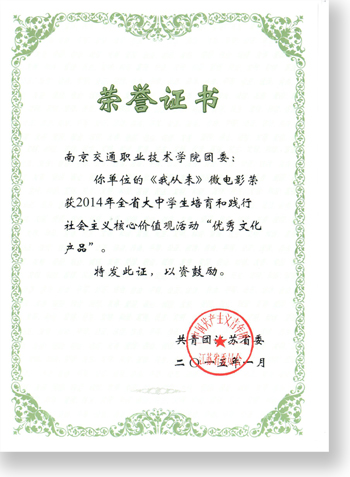 近日,共青团江苏省委发布了《关于表彰2014年全省大中学生培育和践行社会主义核心价值观先进单位、优秀文化产品、优秀项目、优秀组织奖的通知》(团苏委发〔2015〕5号),学院团委喜获培育和践行社会主义核心价值观活动“先进单位”,学生创作的微电影《我从未》获得培育和践行社会主义核心价值观活动“优秀文化产品”。