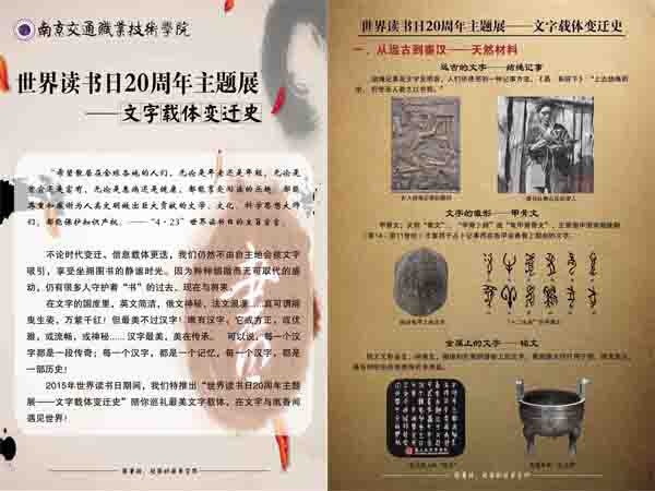 2015年世界读书日,一期精心制作的“世界读书日20周年主题展——汉字载体变迁史”,陪你巡礼文字载体从龟甲、金石天然材料到E-book、手机等电子载体的万年变化历程,在文字与纸香间遇见世界!