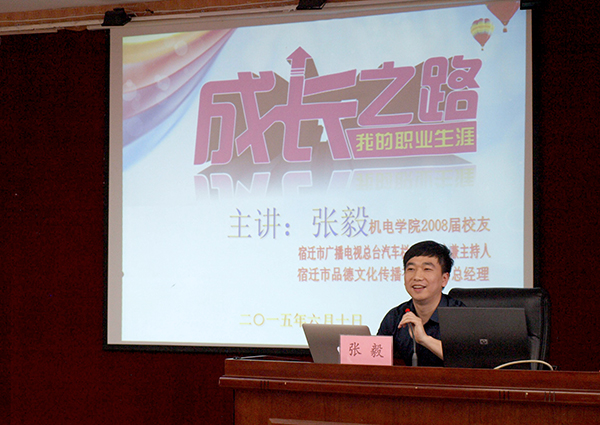 6月10日下午,明德楼报告厅内时而满欢声笑语,时而掌声雷动,来自宿迁市品德文化传播有限公司的学院2008届优秀毕业生张毅为机电学院的400多名师生做了一场主题为“成长之路”的报告会,报告会由机电工程学院沈旭院长主持。