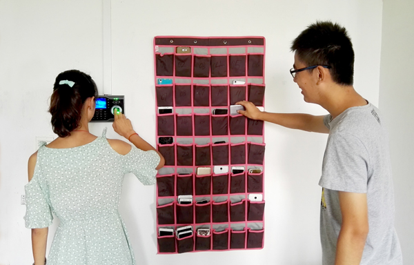 汽车工程学院同学课前打卡考勤,并将手机放入收纳袋,拒做课堂“低头族”