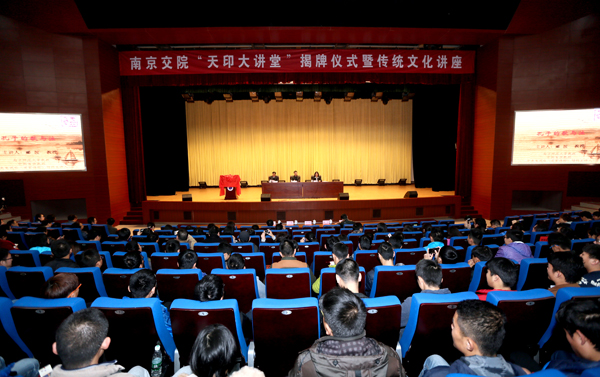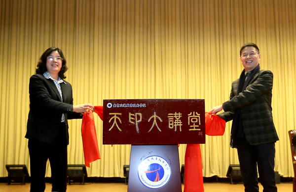 院党委书记贾俐俐和主讲嘉宾——南京师范大学教授、中央电视台《百家讲坛》特约主讲人郦波教授共同为“天印大讲堂”揭牌。