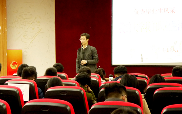 朱枫老师以自身经历为例,讲述了自己如何从一名初出校门的大学生奋斗成长为一名拥有扎实理论知识、丰富专业实践经验的专业教师的历程。他一再提醒在校大学生们一定要做好职业发展规划,珍惜大学学习时光,充分利用课余时间加强社会实践,提高自身综合素质。“术业有专攻”,凡事都要以“干一行爱一行”的态度,脚踏实地,不断提升自我职业发展能力。