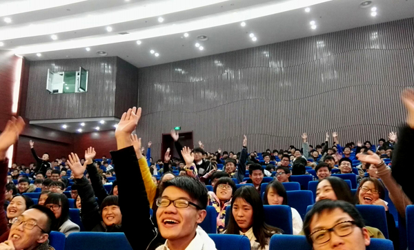常开建校友首先与大家分享了他在校期间的学习经历。不甘平庸的他为突破自己,积极参加学生会主席竞选;为锻炼坚强的意志,在保持学习成绩名列前茅的同时,通过兼职承担了两年的学费与生活费;为提高自己,坚持所爱,工作之初利用一年业余时间学习了本专业之外的汽车维修知识。努力和善于把握机会的品格最终使他成就了今天的成绩。他从学生视角以SWOT法分析了汽车行业的前景、人才需求、电商的发展,并向同学们提出建议:一要永远勤奋,二要抓牢基础,三要不断学习。最后,常开健以现场问答的方式给在场的同学送出小礼物,祝福同学们拥有美好的未来。现场互动热烈,气氛活跃。