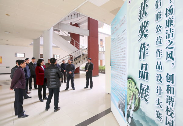 12月15日上午,学院党委书记贾俐俐等院领导一行在明德楼一楼展厅参观了学院第六届“扬廉洁之风 创和谐校园”公益作品设计大赛获奖作品展。