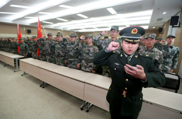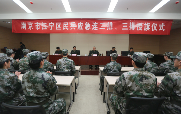 会上,区人武部军事科王钧民参谋宣读了《江宁区民兵应急连二、三排组建的通知》以及《江宁区民兵应急连干部任职命令》,同时呼点了应急连二、三排人员名单;我院汽车工程学院、应急连三排排长朱志同学代表全体民兵作了表态发言;应急连二、三排全体同志们进行了民兵宣誓。