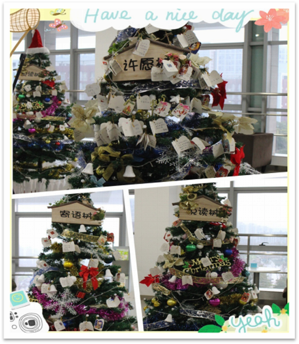 在保留去年三大书愿的基础上,今年的圣诞书愿在内容上进行了升华。从12月14日起,图书馆三楼休闲区放置了三棵2米高的圣诞阅读树,读者自行领取圣诞贺卡,填写新年愿望、读书感言、图书馆寄语或三行诗后悬挂至相应圣诞树上,依树抒情,“书”出对图书馆、家人、朋友、自己的祝福。