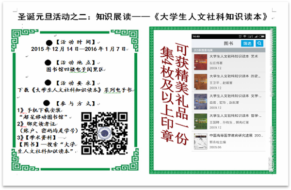 “圣诞元旦悦读季 创意乐趣等你来”活动期间,图书馆再次组织馆员现场解疑答惑,宣传新媒体的优势,新增一批读者加入了我院移动阅读、互动阅读群体。