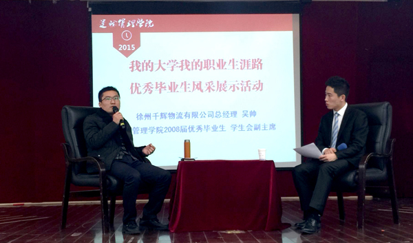 “我的大学我的职业生涯路”优秀毕业生风采展示活动近日邀请了运输管理学院2008届优秀毕业生代表、邳州市千辉物流有限公司总经理、邳州市大学生创业商会常务副会长、运输管理学院青年创业校友联络站徐州邳州站站长吴帅回母校作了题为“认认真真学习,脚踏实地做人”的校友事迹访谈。