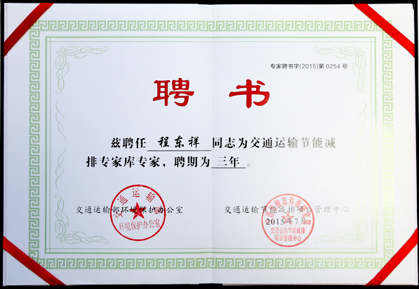 近日,经学院申报,通过交通运输部项目管理中心专家委员会评审,学院节能减排中心副主任程东祥博士被交通运输部环境保护办公室聘任为交通运输部节能减排专家库专家(专家聘书字(2015)第0254号),聘期为三年。