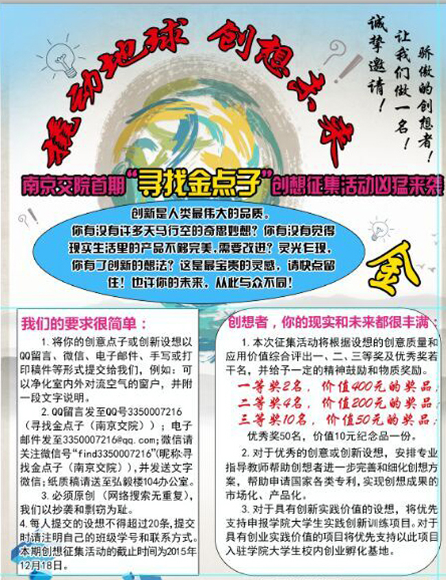 在大众创业、万众创新的时代背景下,为激发青年大学生的创新热情,提升创新创业能力,学院素质教育中心积极创设平台,营造“热爱创新、崇尚创意”的氛围。近期,“撬动地球,创想未来”学院首届“寻找金点子”创意征集活动成功举行。36名“创想者”凭借富有创新性和市场价值的创意方案脱颖而出。