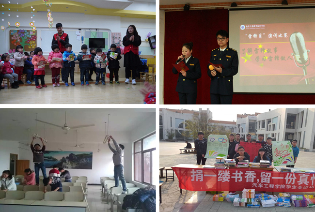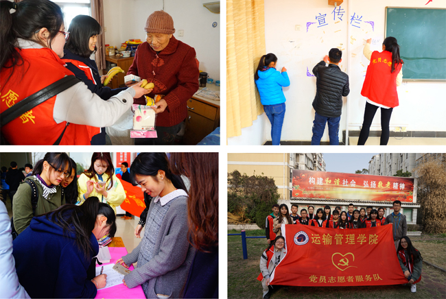 本年度学雷锋活动以“爱心传递正能量 雷锋精神进行时”为主题,在“雷锋月活动统揽全年学雷锋行动”的总体思路下,全院各级团学组织共立项60余个宣传、践行雷锋精神重点活动。根据既定安排,各项活动有序开展、深入推进。汽车工程学院团总支开展了“了解雷锋故事 学习雷锋做人”主题演讲比赛、“关爱儿童 陪伴成长”幼儿园志愿服务、“捐一缕书香 留一份真情”图书捐赠、“三月雷锋温暖人心”特殊教育学校志愿服务、“爱心伞”等活动。路桥与港航工程学院团总支开展了“感动中国十大人物”宣传、清除校园牛皮癣、“寻找身边的雷锋”微信宣传等活动。运输管理学院开展了“雷锋知识知多少”微视频宣传、敬老志愿服务、“衣旧情深、节用惜服”衣物捐赠等活动。电子信息工程学院开展了高桥社区养老服务中心志愿服务,结合专业开展了防电信诈骗义务宣传、电脑系统维护等服务。机电工程学院团总支开展了雷锋精神主题班会、雷锋主题海报设计、“学习雷锋,从我做起,努力践行社会主义核心价值观”主题签名、江宁客运站公益劳动和旅客服务、沐春园护理院服务等活动。建筑工程学院团总支开展了“弘扬雷锋精神 加强法制意识”主题宣传教育、“践行雷锋精神 树立时代新风”画展等活动。人文艺术系赴东山敬老院看望陪护老人、结合专业特色开展了“社会主义核心价值观校园涂鸦”活动.