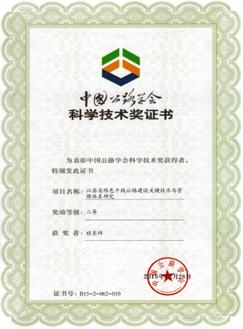 近日,中国公路学会发布“2015年度中国公路学会科学技术奖获奖项目”,学院节能减排中心副主任程东祥博士参与的“江苏省绿色干线公路建设关键技术与管理体系研究”项目获得中国公路学会科学技术奖二等奖(证书号:B15-2-062-010)。