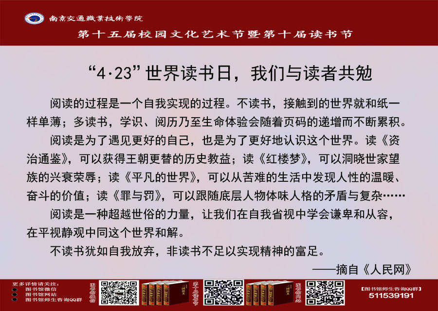 【“4·23”我们与读者共勉】每年的“4·23”世界读书日,图书馆全体馆员通过不同途径倡议读者多读书、多思考。2016年的这一天,图书馆馆员也没有例外,在馆电子屏上推送了摘自《人民网》的一段话: