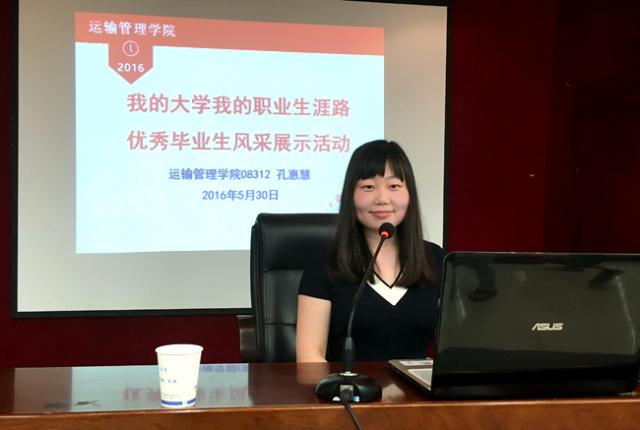 5月30日下午,运输管理学院2008级会计专业优秀毕业生代表孔惠慧同学回到母校,在明德楼报告厅作“我的大学我的职业生涯路”优秀毕业生风采展示专题报告。