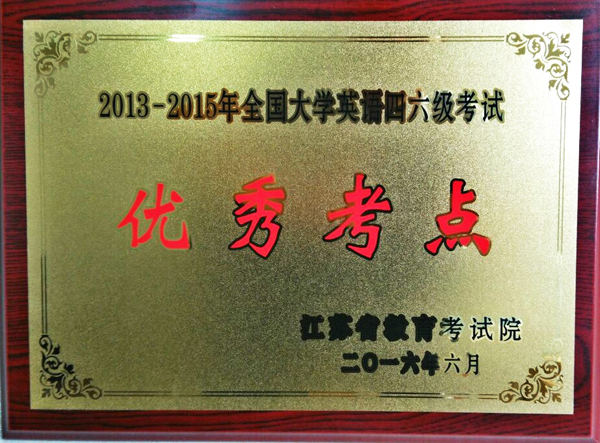 这是继2009-2010年度、2011-2012年度、2013-2014年度学院考点被省教育厅高校专科英语应用能力考试委员会办公室授予 “江苏省高校英语应用能力考试优秀考点”称号后,学院考点首度获得大学英语四六级考试优秀考点荣誉称号。