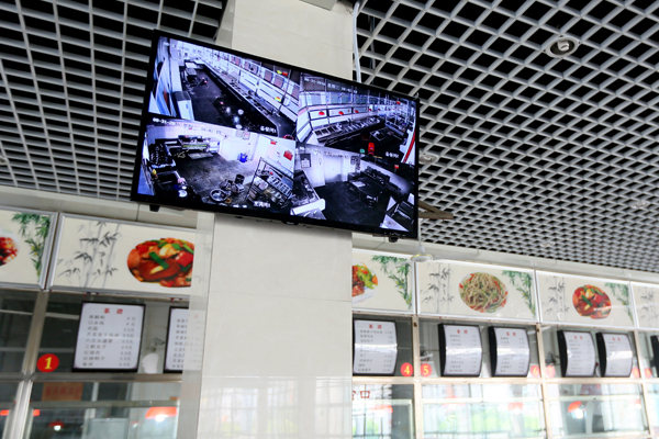 后勤部门在第二食堂试行“明厨亮灶”工程,通过显示屏将后场饭菜制作情况即时展现在用餐大厅,接受师生监督