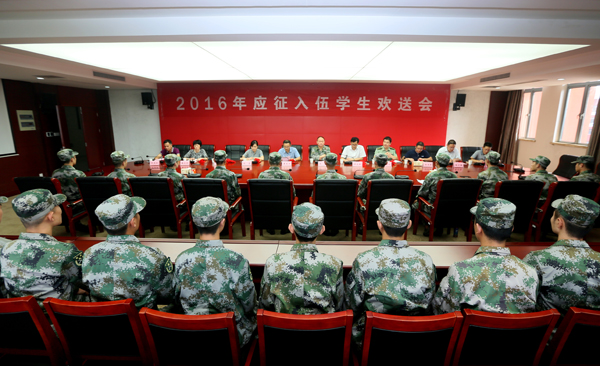 9月7日下午,学院2016年应征入伍新兵欢送会在弘毅楼427会议室隆重举行。南京市江宁区委常委、区人武部部长张荣,学院党委副书记许正林,江宁区征兵办秘书组组长祝保华出席会议。学工处(武装部)、各二级学院党总支负责同志以及全体入伍新兵参加了欢送会。