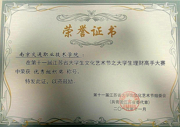 由团省委主办的第十一届江苏省大学生文化艺术节之“国联证券杯”省大学生理财高手大赛颁奖典礼于11月12日在江苏大学举行。全省90所高校参加,共有20所高校获得大赛优秀组织奖,学院是唯一获奖的高职院,获得组委会7000元奖励。本次大赛自5月启动以来,学院积极组织和指导学生参与,报名参赛人数、操作人数占比均名列前茅,总体成绩排名全省第9。大赛对增强和锻炼参赛学生的理财意识与能力产生了积极作用。