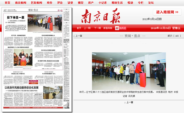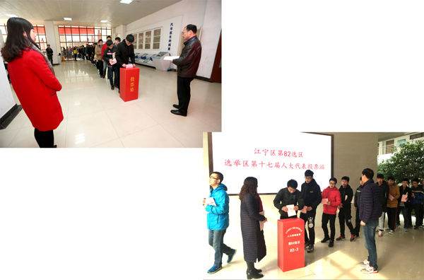 本次区人大代表换届选举工作,历时一个月,学院党委高度重视,选举领导小组、有关职能部门及全体工作人员严格按照选举步骤和程序开展工作,各党总支(直属党支部)各负其责、互相配合,确保了江宁区人大换届选举工作的顺利进行。江宁电视台对学院选区的投票选举活动进行全程拍摄并作相关报道。