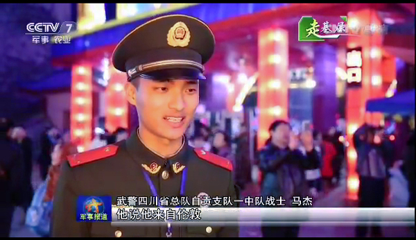 2月11日,中央电视台7套《军事报道》栏目对学院入伍新兵、151061班马杰同学在执行四川自贡元宵国际灯会安保任务中,利用自己的外语优势主动为外国游客引导讲解的暖心之举进行了采访报道。他在接受采访时表示,面对外国游客对中国传统灯会手艺的惊叹和当前中国的高速发展,作为一名共和国军人,感到十分地自豪。