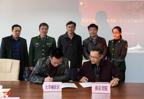 学院和江宁大学城社区签署了《退役士兵(大学生)社区服务工作站共建协议书》,双方并就工作站共建的形式内容、运行机制进行了深入细致的交流,商定了在人才培养、教育帮扶、城市管理以及综合治理等方面相互参与和支持的合作方针。