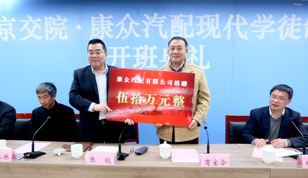 开班典礼上,康众学院院长、江苏康众汽配有限公司售后总监王润良、运输管理学院院长吕亚君分别介绍了“康众学徒制班”基本情况及人才培养方案;学生代表杨伟伟做了交流发言。会上,学院、企业及学生代表签订了《“康众学徒制班”三方协议》,校企双方举行了2017年合作办学经费捐赠仪式。