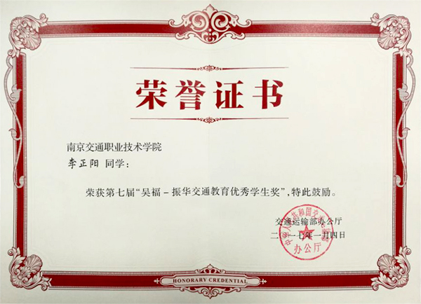 吴福—振华交通教育专项资金由澳门知名人士吴福先生和中国港湾集团振华海湾工程有限公司共同出资建立,用于奖励交通运输类院校优秀教师和学生。去年年底,中华人民共和国交通运输部人事教育司发布《关于开展吴福—振华交通教育奖励专项资金第七次奖励工作的通知》(人教教培〔2016〕209号),在全国交通运输行业相关院校范围内开展评选活动。学院积极组织申报,经交通运输部组织专家审核、交通运输部政府网站公示和吴福—振华交通教育奖励专项资金管理委员会审定,交通运输部同意,学院李正阳同学荣获第七届吴福—振华交通教育优秀学生奖。
