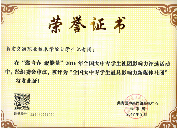 2016年,共青团中央网络影视中心和未来网共同开展了第一届“燃青春 聚能量”全国大中专学生社团影响力评选活动,结果于2017年4月揭晓,学院大学生记者团被评为“全国大中专学生最具影响力新媒体社团”,全国获此奖项的学生社团共66个。