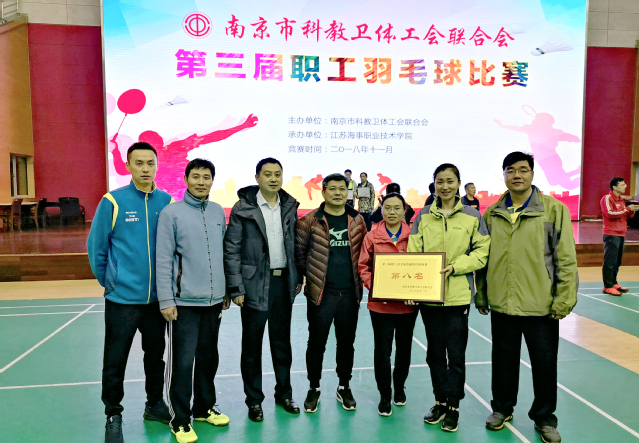 11月10日、11日,由南京市科教卫体工会联合会主办的“南京市科教卫体工会联合会第三届羽毛球比赛”在江苏海事职业技术学院体育馆举行,来自全市科教卫体系统的63个单位代表队、450余名职工参加了比赛。学院教职工代表队顽强拼搏,团结协作,首次闯进团体决赛获得第八名的好成绩。