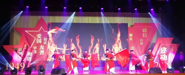 南京交通职业技术学院带来恢宏热烈的开场舞《旗开得胜》,拉开了庆祝表演的序幕。
