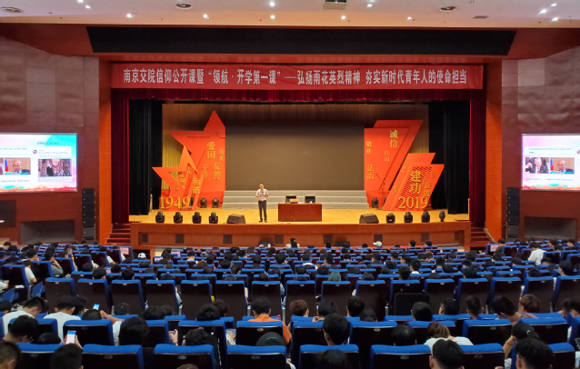 根据团省委“学子心向党 启航新时代”系列庆祝中华人民共和国成立70周年主题活动安排,以新学期开学为契机,加强大学生思想政治引领工作,充分发挥团组织的育人优势,引导同学们坚定听党话、跟党走的理想信念,学院于9月23日晚以“信仰公开课”的形式举办“领航.开学第一课”。南京师范大学马克思主义学院王磊副教授应邀为500余名师生作了题为“弘扬雨花英烈精神 夯实新时代青年人的使命担当”的主题报告。